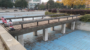本次大赛主要针对beat365体育官网平台东园图书馆前坪喷泉水池上的两座人行桥进行外观造型设计,为该人行桥提质改造深化设计提供参考。现有的人行桥如图1、图2所示,人行桥所处的位置见图3。
